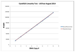 PI染色的雞紅血球細胞核實驗中完美的線性關係證明CytoFLEX系統的優秀表現。